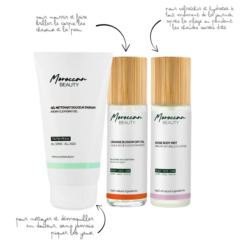 Gardez votre peau saine, hydratée et fraîche tout au long de l'été avec le Summer Set . Nettoyez votre peau en douceur avec notre Gel Nettoyant Douceur D'Argan. Laissez-vous séduire par l'Huile sèche à la fleur d'oranger, une véritable alliance d'hydratation et de nutrition pour le corps, le visage et les cheveux. Enrichie en huile de sésame et en fleur d'oranger, elle hydrate intensément sans laisser de film gras, tout en apportant un éclat subtil et un parfum délicat. Ensuite, vaporisez la Brume corporelle à la rose pour envelopper votre peau d'un voile doux de fraîcheur et prolonger l'hydratation tout au long de la journée.